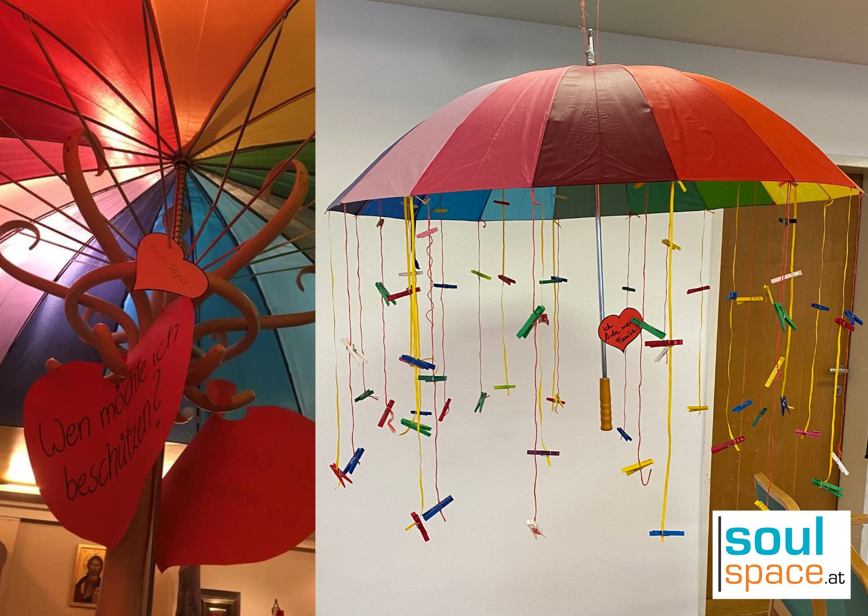Du kannst ein Herz bemalen, beschriften und in den Schirm hängen.